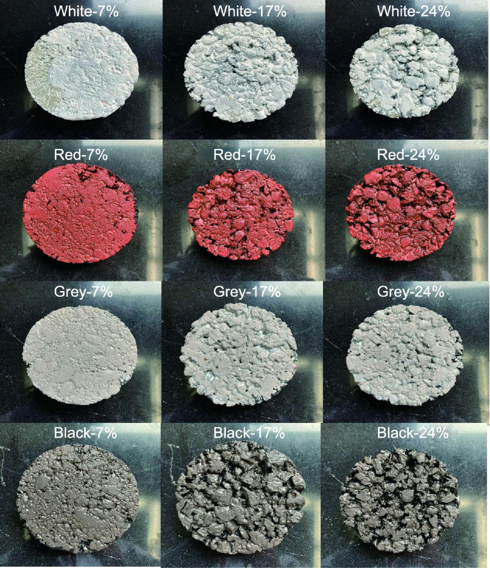 Twelve reflective cooling asphalt concrete specimens with four types of coatings (white, red, gray, and black) and three different void ratios (7%, 17%, and 24%) were prepared for the experiments. All coatings were composed of water-based acrylic emulsion, functional fillers and pigments, additives, and deionized water. The TiO2 was selected as the reflective pigment, while red iron oxide and black CuO were used as colored pigments. For white coatings, the functional fillers included conventional rutile titanium dioxide (R-TiO2) and near-infrared titanium dioxide (NIR-TiO2) pigments. For colored reflective coatings, considering better optical performance in the near-infrared solar radiation region, the near-infrared TiO2 was selected as the functional reflective filler. Regarding the components of the colored coatings, the proportions of red iron oxide, R-TiO2, and NIR-TiO2 were 5:25:8, which were determined in Ref. [27]. Additionally, for all coatings used in this study, ZnO with a particle size of 30 nm was selected as the anti-aging additive (results of the preliminary research in Ref. [3]). The preparation process for the samples was detailed in Ref. [28]. The composition of the four reflective cooling coatings is shown in Table 1, and the basic information and reflectance properties of the 12 reflective cooling asphalt concrete specimens are presented in Fig. 1 and Table 2.