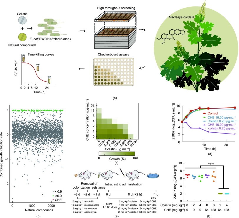 The emergence and spread of the mobile colistin-resistance gene mcr-1 pose a challenge to the use of colistin, a last-resort antibiotic used to treat severe infections caused by extensively drug-resistant (XDR) Gram-negative pathogens. Antibiotic adjuvants are a promising strategy to enhance the efficacy of colistin against colistin-resistant pathogens. Chelerythrine, derived from the traditional Chinese medicine plant Macleaya cordata, exhibits dual inhibitory effects on mobile colistin resistance by impairing the function of mcr-1 and limiting the dissemination of mcr-1-carrying plasmids. A detailed analysis reveals that chelerythrine binds to phospholipids on bacterial membranes and increases cytoplasmic membrane fluidity, thereby impairing respiration, disrupting the proton motive force, generating reactive oxygen species, and decreasing intracellular ATP levels, which subsequently downregulates mcr-1 and conjugation-associated genes. These dual effects of chelerythrine can expand its use of antibiotic adjuvants and may provide a new strategy for circumventing mobile colistin resistance. (This image was conceived by Dr. Lu Yang from Shanghai University of Sport and Ms. Yunrui Tian from China Agricultural University.)