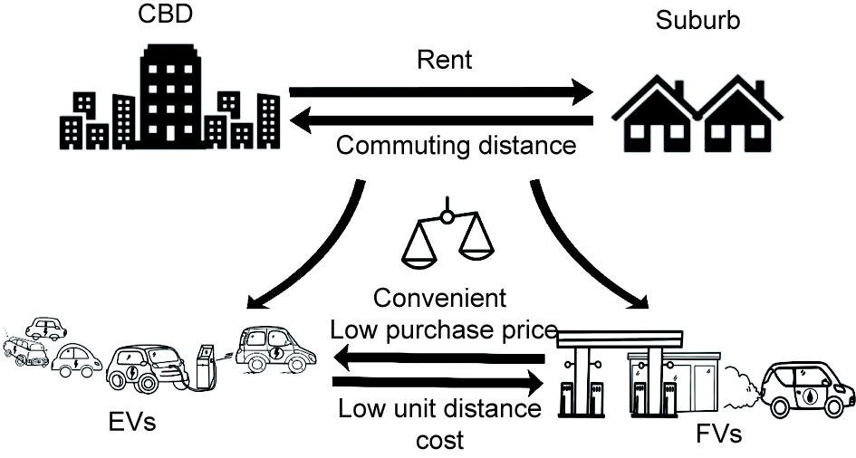 Exploring Electric Vehicle Purchases and Residential Choices in a Two-Dimensional Monocentric City: An Agent-Based Microeconomic Model