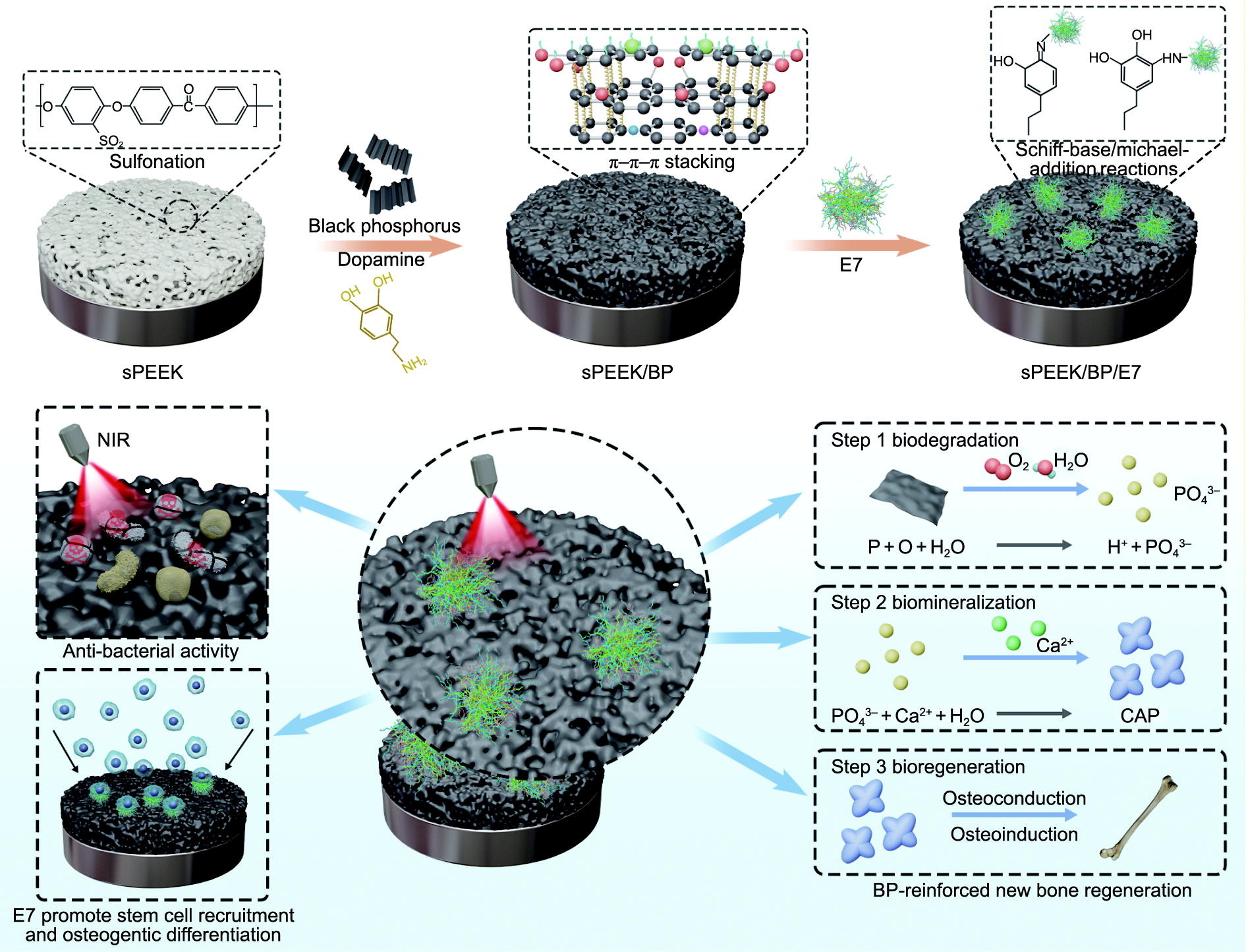 Black Phosphorus and E7-Functionalized Sulfonated Polyetheretherketone with Effective Osteogenicity and Antibacterial Activity